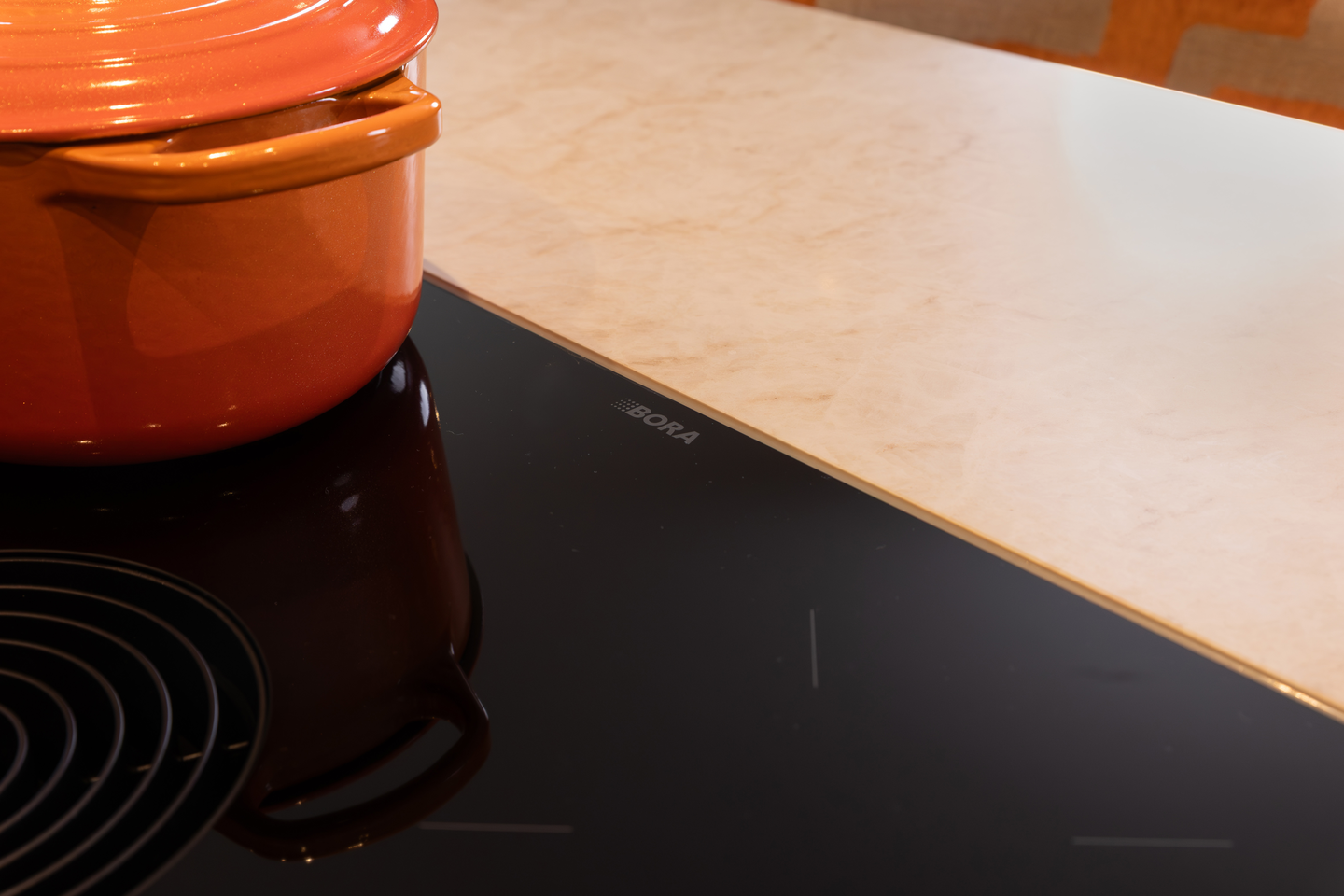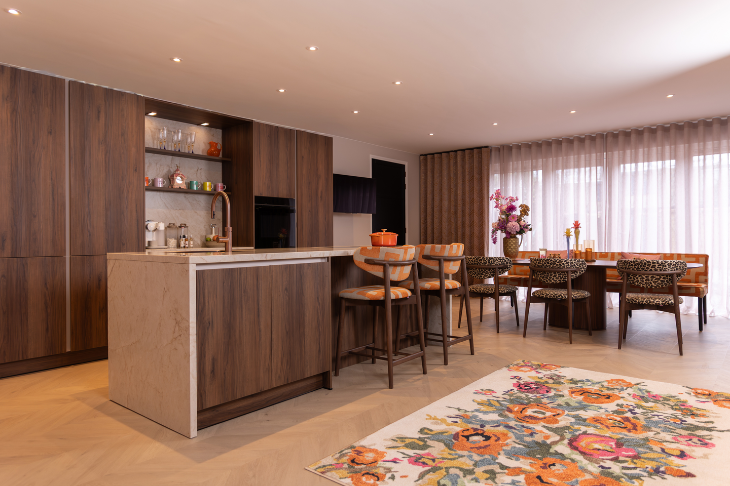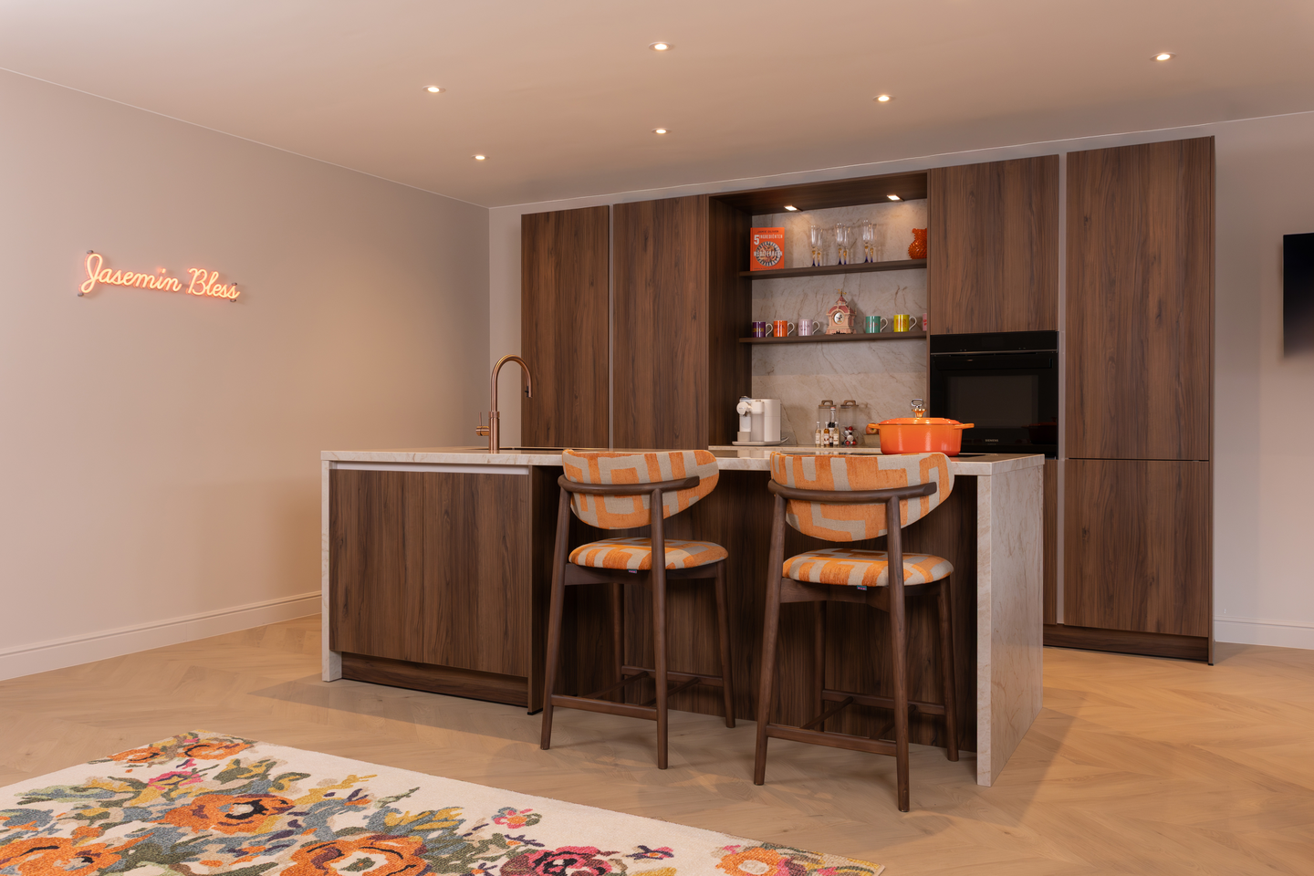 Gedurfde walnoot keuken met oranje accenten
