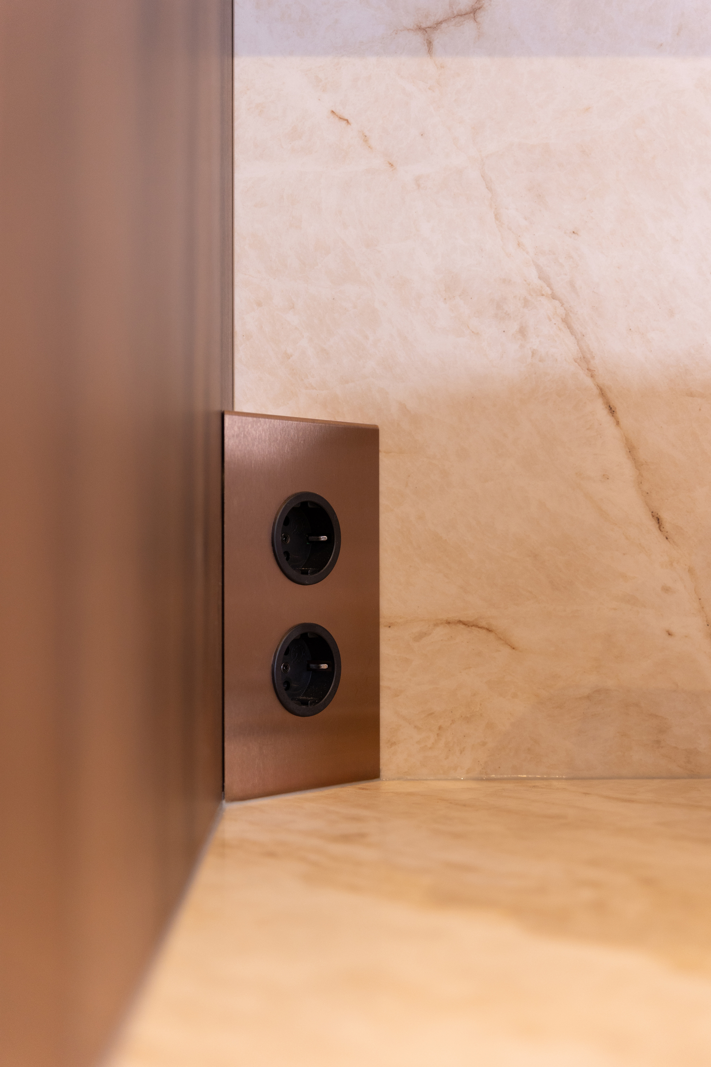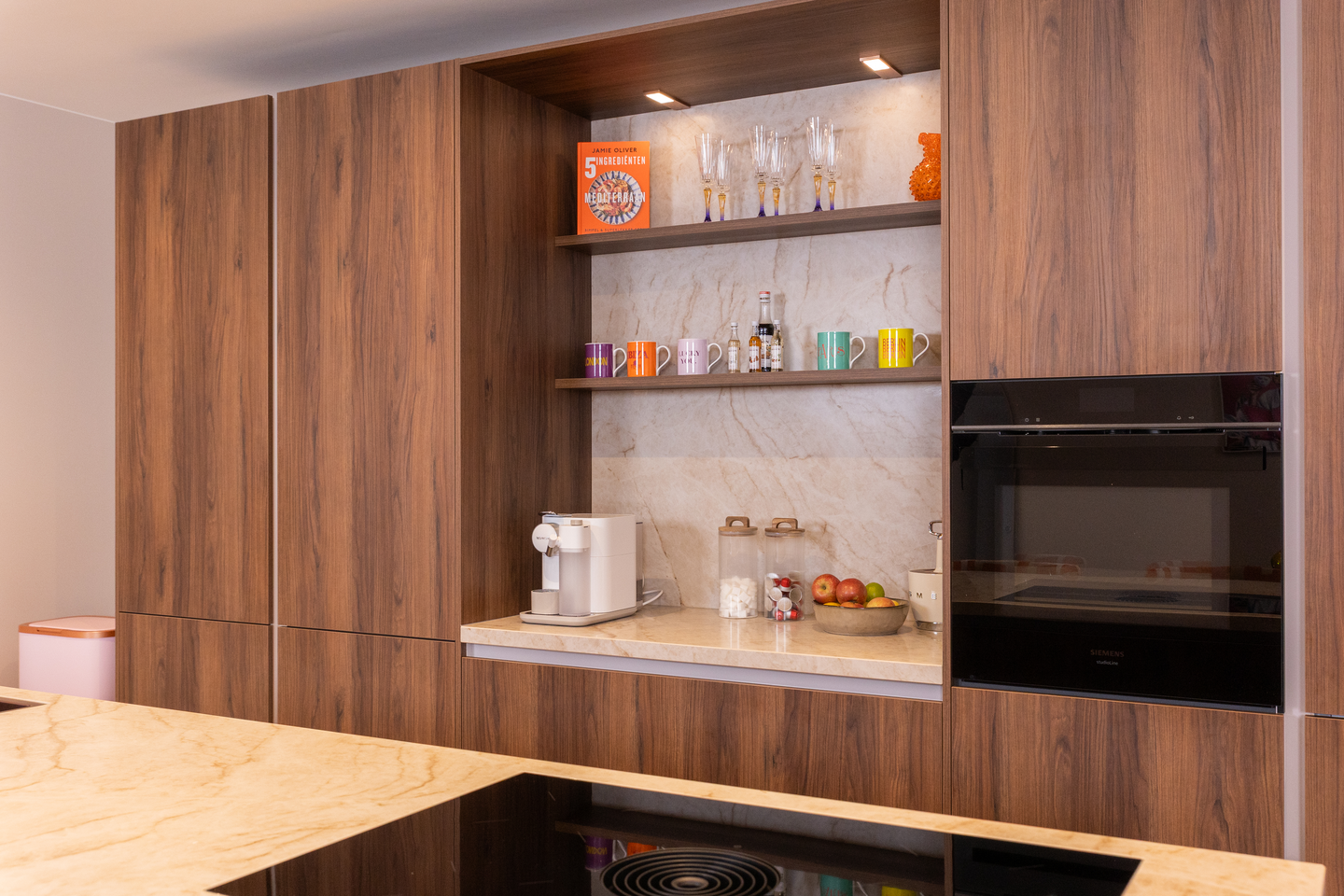 De ideeën en tips van de adviseur maken de nieuwe keuken van Yasemin helemaal af. ‘Ik wilde in eerste instantie een standaard oven, maar ze overtuigde mij om een oven met magnetronfunctie te nemen. De magnetron gebruik ik in de praktijk best vaak, dus daar ben ik nu erg blij mee. Daarnaast kwam ze met het idee voor koperen inbouwspots en koperen stopcontacten in de koffienis. Helemaal in stijl met de andere koperkleurige keukenaccessoires. Ze heeft echt overal aan gedacht: ik kan zowel de vaatwasser in het kookeiland als de lades in mijn koffienis open trekken, zonder dat het tegen elkaar aankomt. Handig als ik de vaatwasser uitruim.’