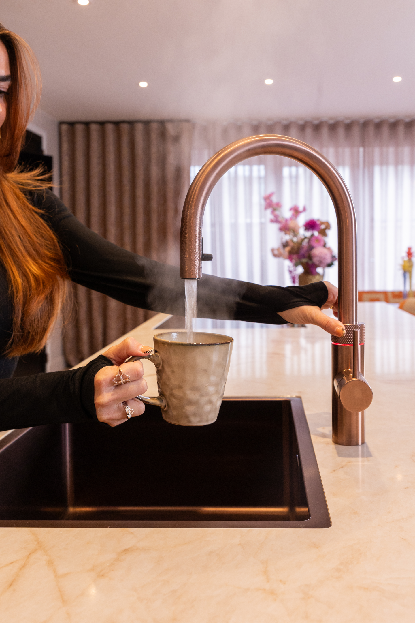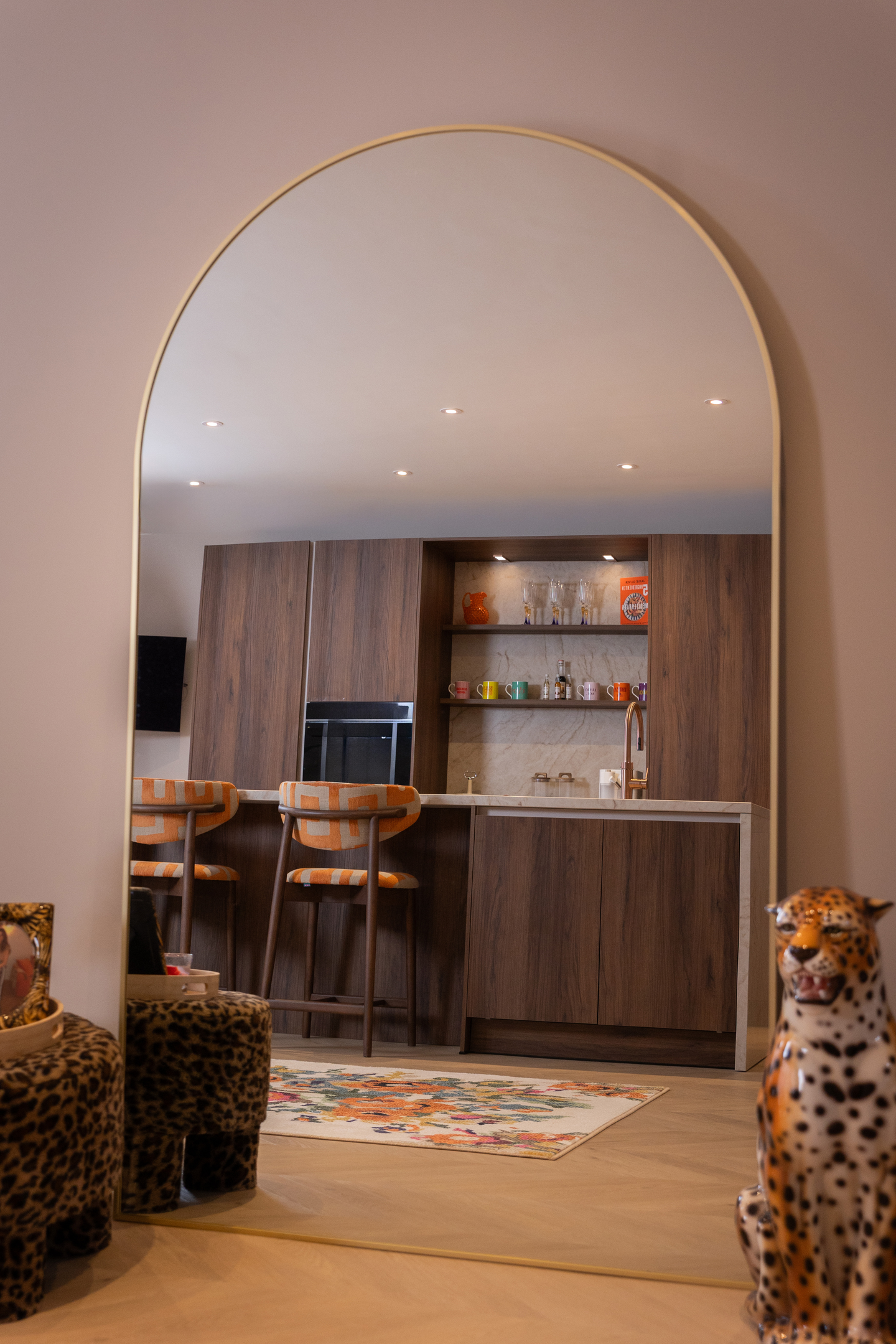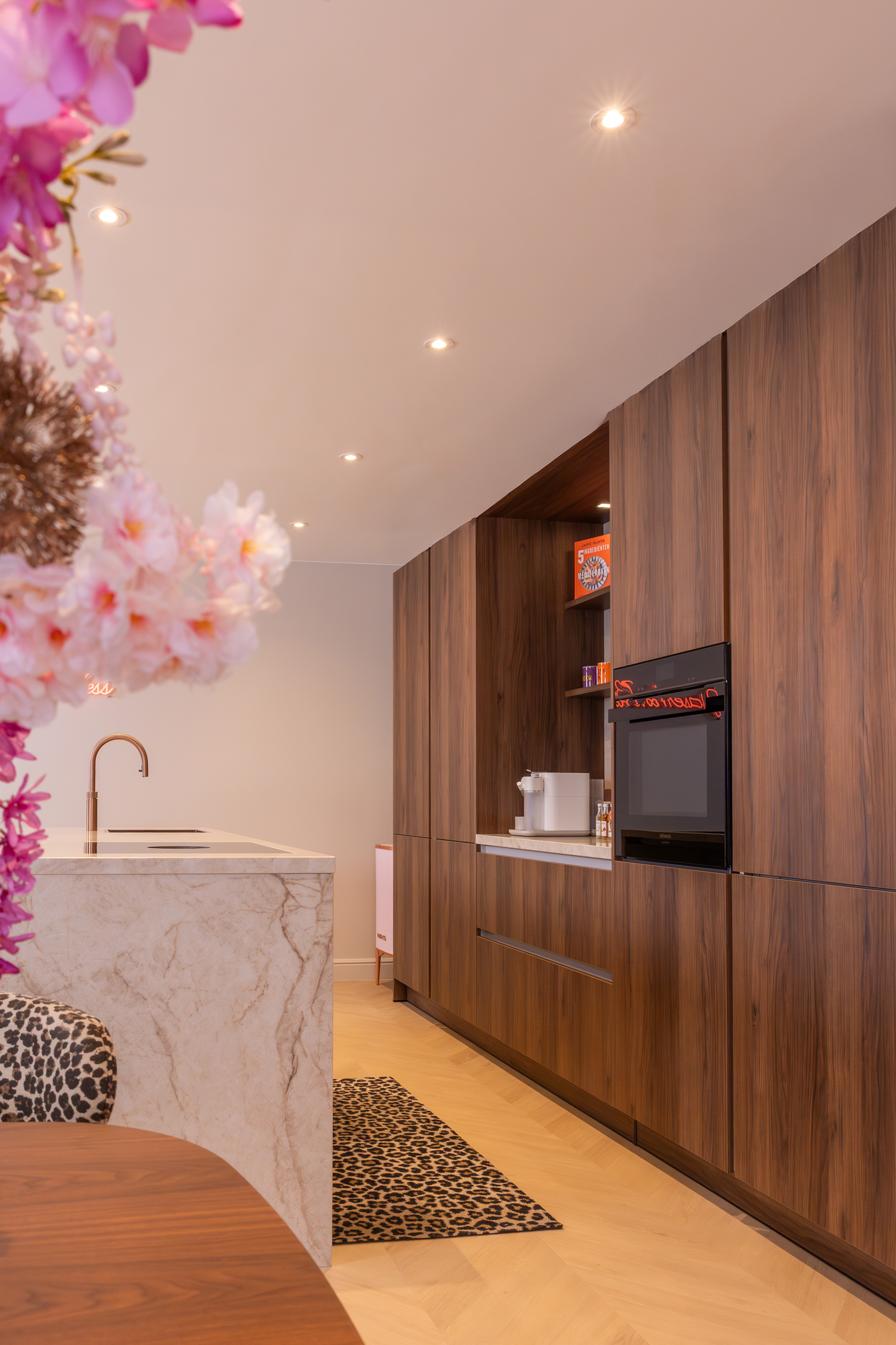 Yasemin laat de Quooker, de wasbak en enkele andere keukenaccessoires uitvoeren in rosé koper. ‘Dat heb ik om mij heen nog niet veel gezien en dat vind ik juist leuk. Ik doe het graag net even anders’, zegt ze lachend. ‘Ik vind het erg leuk om een huis in te richten. Ik heb er wel een beetje stress van gehad, maar ik ben ook heel blij met het resultaat. Mijn woon- en keukenstijl zou ik omschrijven als gewaagd. Ik heb veel panterprints in huis en mijn eetkamerbank en barkrukken zijn oranje. De basis zoals de vloer en muren zijn rustig, maar verder hou ik erg van het toevoegen van kleur.’